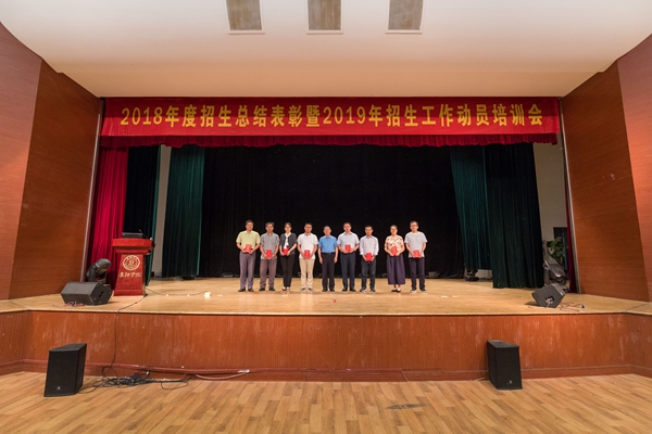 党委副书记笪佐领宣读了2018年招生贡献奖表彰文件,江苏省内招生获奖代表和外省招生获奖代表16人分别上台领奖。随后江苏省苏州工作组代表高鹏副院长、外省安徽组代表叶传标副院长分别进行了典型交流发言,分享了2018年各自招生工作的经验、做法和体会,并对2019年如何做好招生工作提出了建议。