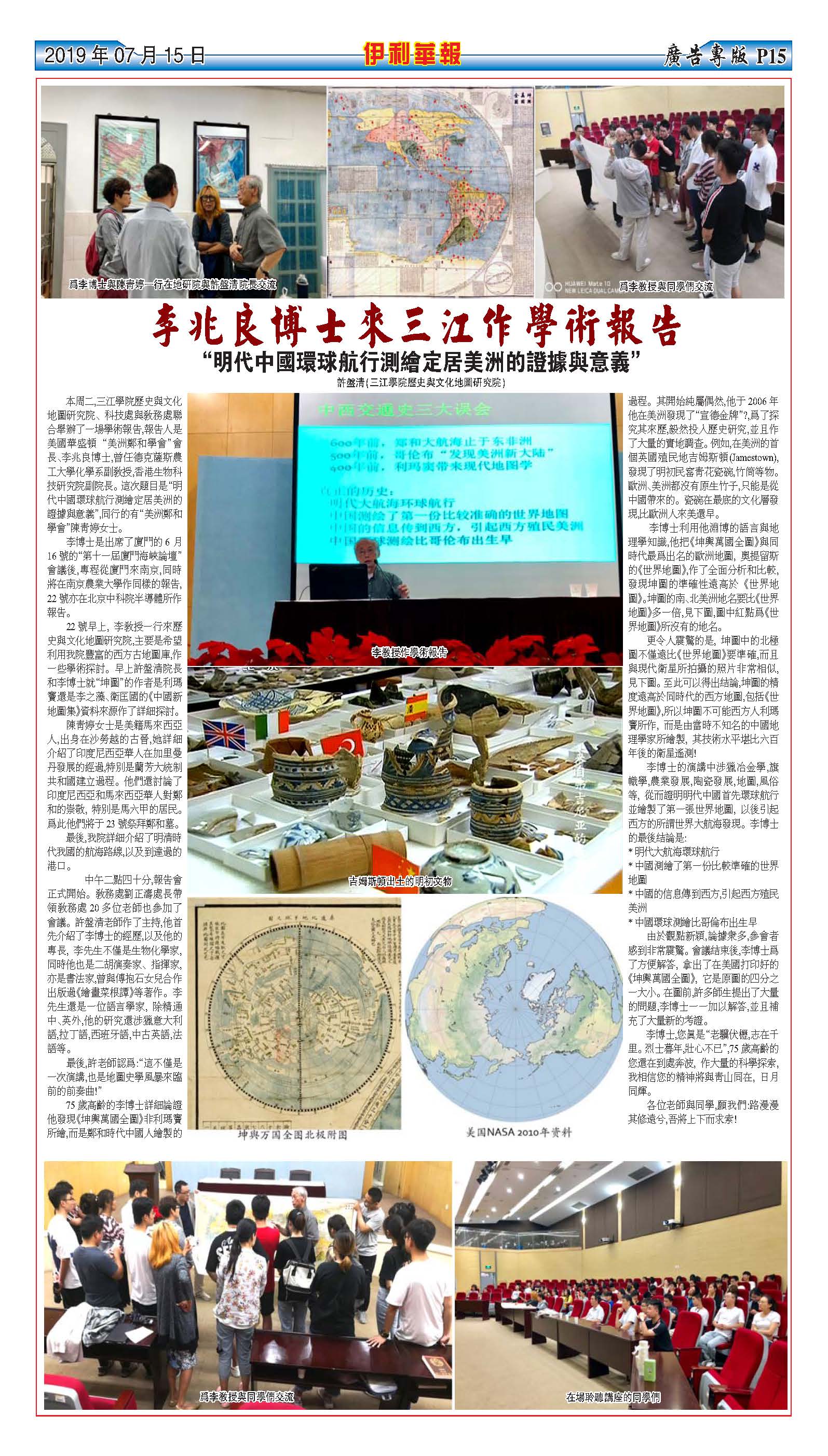 6月下旬,美国华盛顿“美洲郑和学会”会长,原德克萨斯农工大学副教授,香港生物科技研究院副院长李兆良博士来beat365作了一场题为“明代中国环球航行测绘定居美洲的证据与意义”的学术报告,beat365历史与文化地图研究院许盘清院长、教务处刘正涛处长及100多名师生共同聆听了李博士的报告。美国东部知名的华人报刊“伊利华报”对学术报告作了报道。