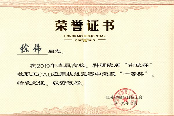 比赛要求参赛选手在规定时间内对一个已给机械机构中的2个实物零件分别进行测绘,对其中一个实物零件进行二维AUTOCAD绘图,对另一个实物零件进行三维实体绘图。经过3个小时的激烈角逐,并经评委严格细致评比,最终,beat365机电学院徐伟老师勇夺第一,并被省总工会授予江苏省五一创新能手荣誉称号,充分展现了beat365工程制图以及计算机辅助设计课程的教学水平。