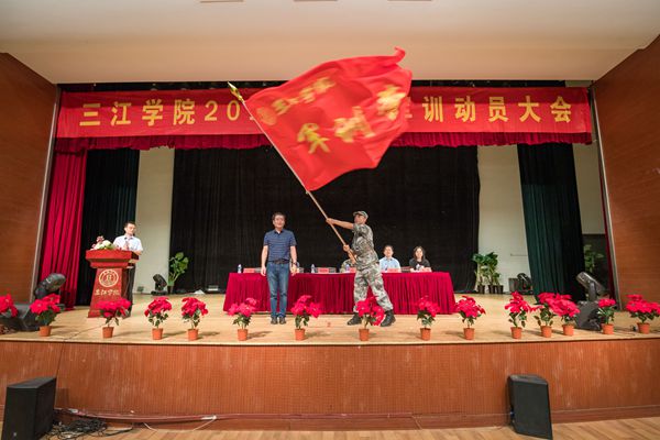 学生工作部(人民武装部)部长周学军在大会上向军训团授旗,并进行动员讲话,他对2019级新生以及帮训的中国人民解放军31604部队的领导、教官们表示欢迎和感谢,希望同学们端正态度,尊重教官,严格训练,遵守纪律;希望相关学院辅导员老师们,全力配合教官高质量完成训练任务,在军训期间和同学深入交流,掌握学生的思想动态;同时希望教官们认真、科学施训,严格要求,牢固树立“安全第一”的思想。