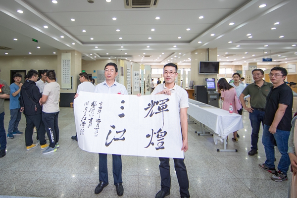 党委常务副书记、副校长周更生为活动致开幕辞,他向到场的诸位来宾致以诚挚的问候,对于兄弟高校及龙神书画艺术研究院、中国书法家园网、南京市青年书法家协会的大力帮助支持,表示衷心的感谢。70年砥砺奋进,我们的国家发生了翻天覆地的变化,他倡导广大师生通过书画篆刻作品创作及展览、参观的方式,展现新中国成立以来的伟大成就,讴歌新时代,唱响主旋律,充分展示beat365师生积极昂扬、奋发向前的精神面貌。随后龙神书画艺术研究院院长、中国书法家协会会员龚洪林致辞,beat365英国官网网站一直以来重视人文发展,积极参加书画活动,在江苏名列前茅。新竹高于旧竹枝,全凭老干为扶持。龚院长语重心长地叮嘱三江学子,从三江走出的学生,应心怀感恩,为三江争光添彩。