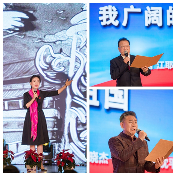 诗会第一篇章“在这片辽阔的土地上” 徐徐拉开帷幕。“那是我们共同生活的祖国啊,无论身在何处,我们的祖国依旧在我心。”江苏省广电集团著名播音员戈弋老师带病忍着剧痛,坚持在舞台上深情地朗诵了江耶的《我广阔的祖国》,声情并茂。江苏省演艺集团江苏话剧院院长、江苏省朗诵协会会长高英老师带来了舒婷的《祖国啊,我亲爱的祖国》,伴随着沙画表演,一粒粒平凡无奇的沙粒勾勒出了伟大祖国的英雄纪念碑、和平鸽、万里长城。“我们的祖国已经走过了七十年的岁月,未来的祖国必定会走得更加坚定,因为我们都深深眷恋着我们的祖国,祖国已走过七十年,我们也迎来了一个新世纪的开端。”江苏省广电集团新闻主播张沈平给我们带来了孙晓杰的《祖国》,歌颂我们的祖国,表达对祖国深沉的爱。