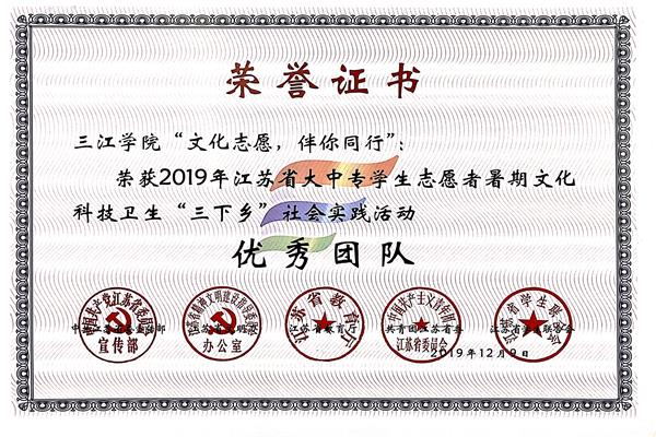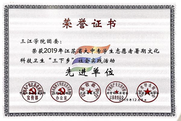 近日,省委宣传部、省文明办、省教育厅、团省委、省学联联合发文总结2019年江苏省大中专学生志愿者暑期文化科技卫生“三下乡”社会实践活动,对工作中表现突出单位、团队、个人等项目进行表彰。beat365英国官网网站获得2019年全省暑期社会实践先进单位称号,同时获评2支优秀团队,1篇优秀调研报告,3名先进个人和2名先进工作者。
