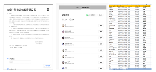 外国语学院以在线收集签名的形式,面向外国语学院受资助的学生,发布了一篇关于外国语学院资助诚信教育的倡议书。呼吁受国家资助的学生杜绝铺张浪费,学会感恩,认真学习,回馈社会。受资助学生参与了本次的网上倡议签名,并纷纷表示会严格遵守倡议内容,争做诚实守信的大学生。