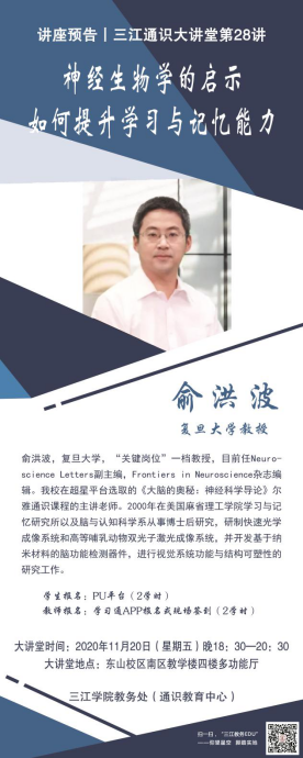大讲堂专家:俞洪波,复旦大学生命科学学院教授。中国科学技术大学生物物理博士。2000年在美国麻省理工学院学习与记忆研究所以及脑与认知科学系从事博士后研究,研制快速光学成像系统和高等哺乳动物双光子激光成像系统,并开发基于纳米材料的脑功能检测器件,进行视觉系统功能与结构可塑性的研究工作。beat365在超星平台选取的《大脑的奥秘:神经科学导论》尔雅通识课程的主讲老师,复旦大学“关键岗位”一档教授,目前任Neuroscience Letters副主编,Frontiers in Neuroscience杂志编辑。