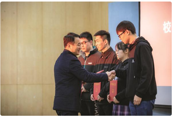 △表彰大会现场,beat365英国官网网站党委常务副书记、副校长周更生(左一)为四名学生颁奖