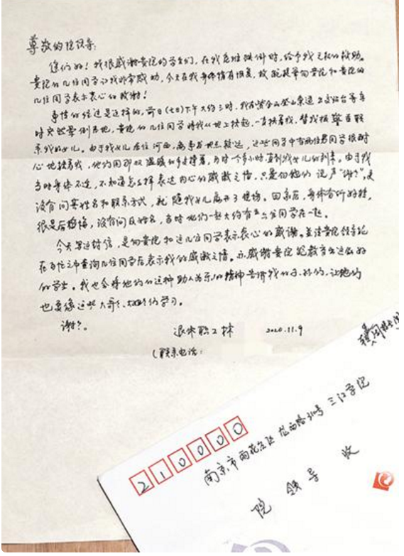 当时情况危急,但如何做到当机立断,第一时间伸出援助之手?其实心里还在想会不会给自己带来麻烦的时候,人就已经走过去扶了。李彦杰分享当时的心情。高静颖表示,看到林奶奶被女儿接走后,心里特别开心,后来大家也没再提起此事,没想到一个月后,林奶奶特地写信到学校找我们。李彦杰和庄鹏至今都觉得,自己不过是做了一件力所能及的小事。