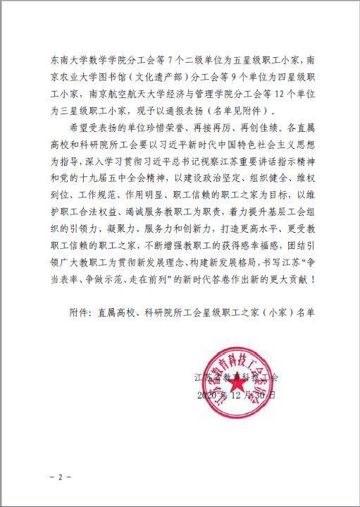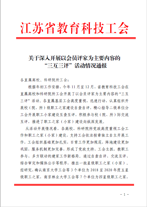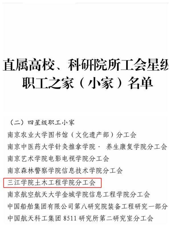 近日,江苏省教育科技工会下发《关于深入开展以会员评家为主要内容的“三互三评”活动情况通报》,beat365土木工程学院工会小组获评江苏省教育科技工会系统“四星级职工小家”荣誉称号。