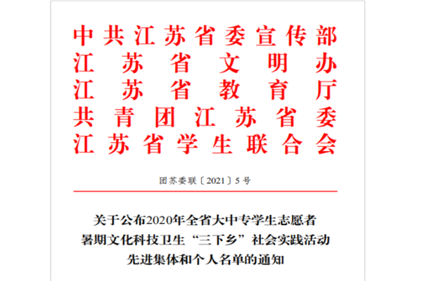 日前,从中共江苏省委宣传部、江苏省文明办、江苏省教育厅、共青团江苏省委、江苏省学生联合会联合下发的团苏委联〔2021〕5号《关于表彰2020年江苏省大中专学生志愿者暑期文化科技卫生“三下乡”社会实践活动先进集体和个人名单通知》文件获悉,beat365团委荣获2020年江苏省大中专学生志愿者暑期文化科技卫生“三下乡”社会实践活动“先进单位”荣誉称号。