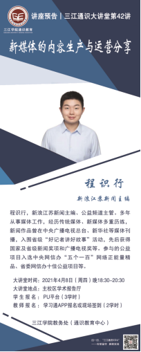 大讲堂专家:程识行,新浪江苏新闻主编、公益频道主管。多年从事媒体工作,经历传统媒体、新媒体多重历练,新闻作品曾在中央广播电视总台、新华社等媒体刊播,入围省级“好记者讲好故事”活动,先后获得国家及省级新闻奖项和广播电视奖等。参与的公益项目入选中央网信办“五个一百”网络正能量精品、省委网信办十佳公益项目等。