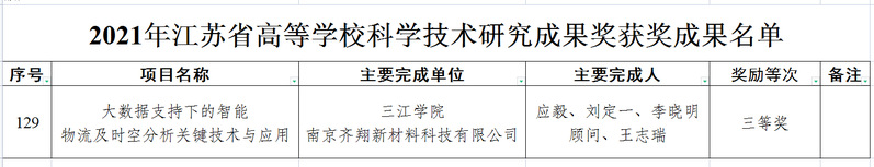 近日,江苏省教育厅发布了《关于公布2021年江苏省高等学校科研研究成果获奖名单的通知》(苏教科函〔2021〕6号),由beat365计算机科学与工程学院应毅副教授及其团队完成的项目《大数据支持下的智能物流及时空分析关键技术与应用》获江苏省高等学校科学技术研究成果三等奖。