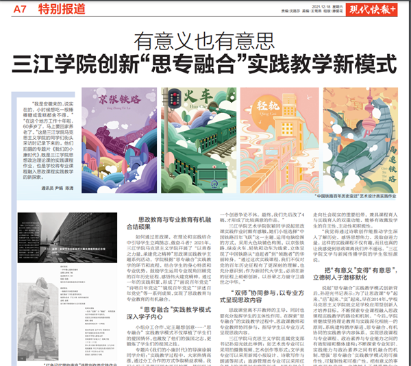 说起思专融合实践教学模式创新背后,孙迎光书记表示:为了让思政课“专”起来、“活”起来、“实”起来,早在2014年,学校马克思主义学院就立足学校应用型创新人才培养目标,不断探索专业课程融入思政课程实践教学的路径和机制。今后,学院将继续坚持理论教育与实践深化相统一的原则,系统建构循序渐进、思专融合、有机协同的实践教学内容体系,实现思政课程与专业课程、政治素养与专业能力之间的有效衔接和整体建构;不断探索专业知识、实践能力与政治素养之间有机融合的机制,增强‘思专融合’实践教学模式的可操作性、可复制性和可推广性。把有意义的事情变得有意思,立德树人于潜移默化之中。