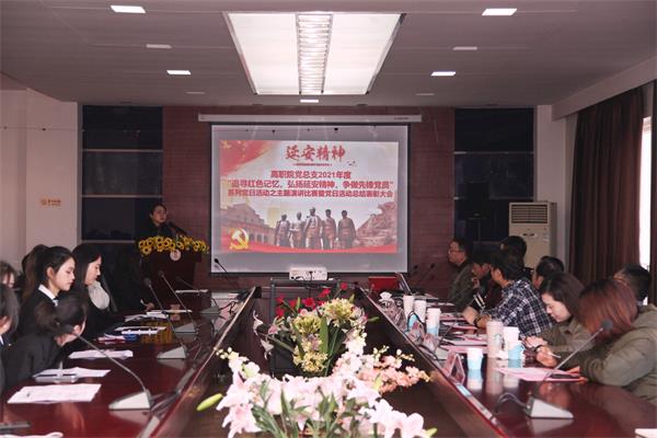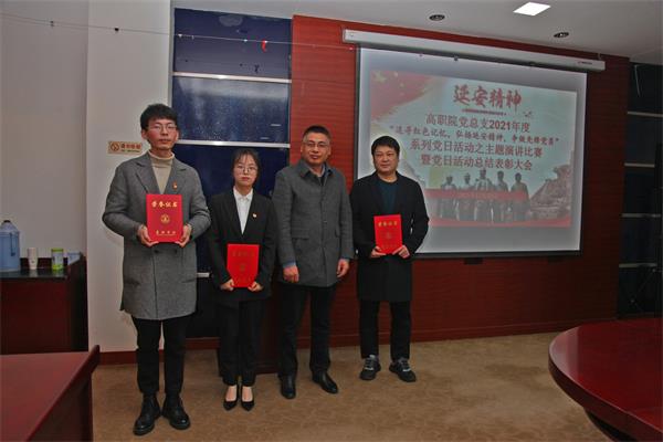 沈爱军代表高职院党总支对2021年度主题党日系列活动进行了总结。他说,今年恰逢建党100周年,全国上下都在认真开展党史学习教育,党总支经充分研讨,最终确定2021年度主题党日系列活动的主题为“追寻红色记忆,弘扬延安精神,争做先锋党员”。上半年在充分理论学习的基础上,沿着革命先辈的足迹走进延安,亲身感受红色峥嵘岁月,并在此基础上适时开展了“党员示范岗”创建活动;下半年在前期理论与实践学习的基础上,为将学习习近平总书记在庆祝中国共产党成立100周年大会上的讲话精神引向深入,进一步深入开展党史学习教育,党总支组织开展了主题征文和演讲比赛。随着本次主题演讲比赛的顺利举行,年度主题党日系列活动画上了一个完美的句号。经过前期征文评审以及现场评委打分,征文和演讲比赛按教师和学生两个组别分别评选出一、二、三等奖,并现场进行了颁奖表彰。