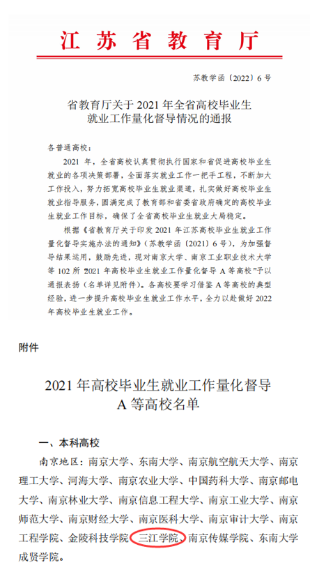 近日,江苏省教育厅印发《省教育厅关于2021年全省高校毕业生就业工作量化督导情况的通报》(苏教学函〔2022〕6号)文件,beat365被评定为“2021年高校毕业生就业工作量化督导A等高校”,并获通报表扬。