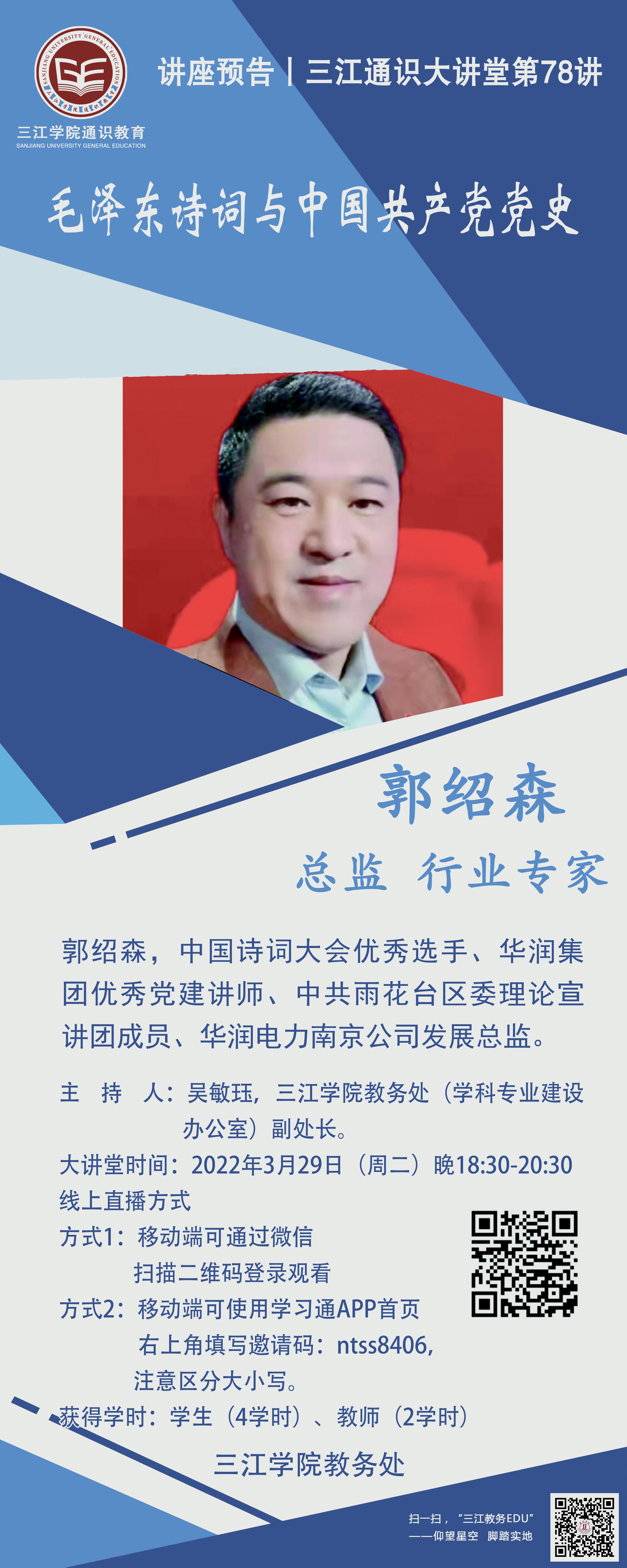 大讲堂专家:郭绍森,中国诗词大会优秀选手、华润集团优秀党建讲师、中共雨花台区委理论宣讲团成员、华润电力南京公司发展总监。