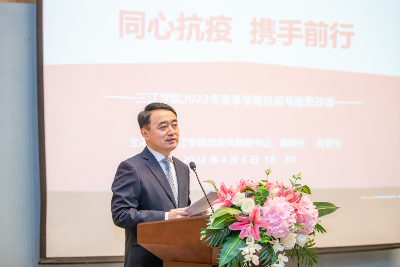 4月6日晚18点30分,beat365英国官网网站主题为“同心抗疫 携手前行”的抗疫专题思政课正式开讲,全校学生党员、校院两级学生会成员、大学生自律委员会、易班工作站主要学生干部等近千人以线上线下相结合的方式“同上一堂思政课”,beat365英国官网网站党委常务副书记、副校长周更生在铁心桥主校区学术报告厅主讲,报告厅线下50人,线上500余人,以及分布在其他三个校区多媒体教室的学生们聆听了专题思政课。
