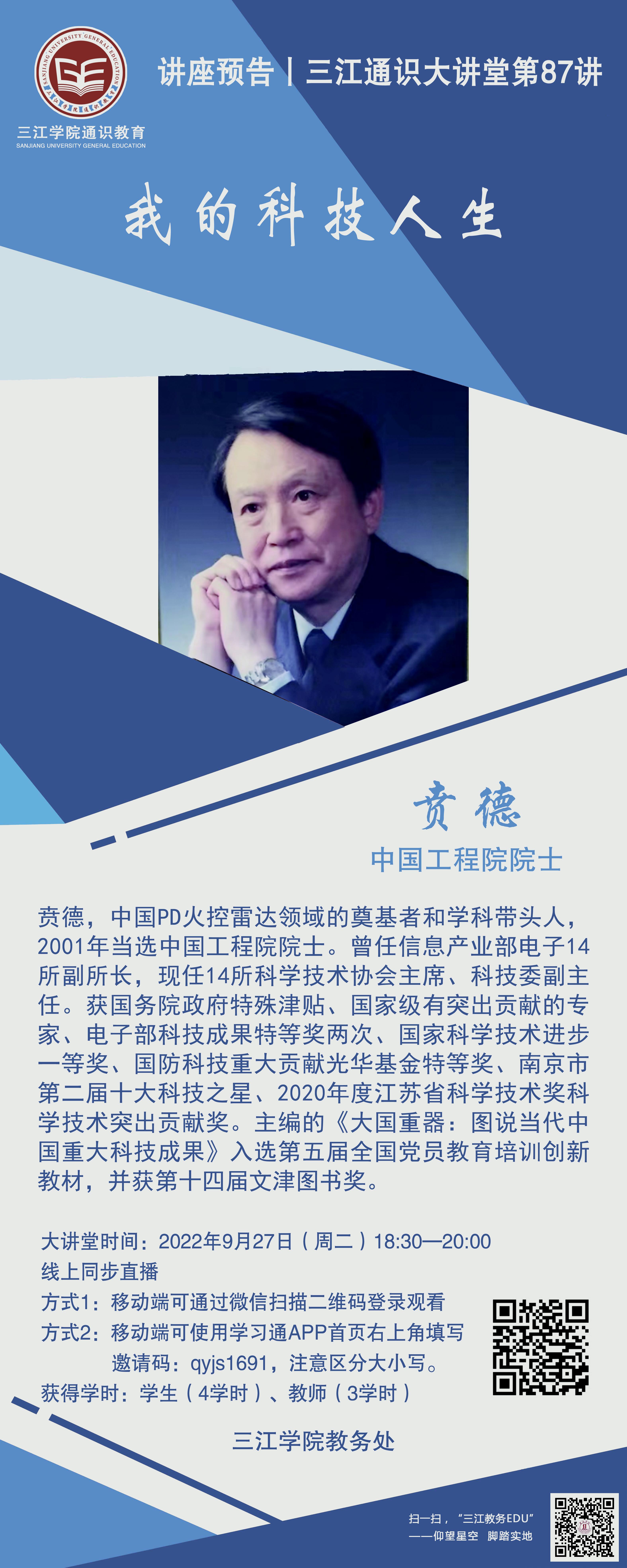 大讲堂专家:贲德,中国PD火控雷达领域的奠基者和学科带头人,2001年当选中国工程院院士。曾任信息产业部电子14所副所长,现任14所科学技术协会主席、科技委副主任。获国务院政府特殊津贴、国家级有突出贡献的专家、电子部科技成果特等奖两次、国家科学技术进步一等奖、国防科技重大贡献光华基金特等奖、南京市第二届十大科技之星、2020年度江苏省科学技术奖科学技术突出贡献奖。主编的《大国重器:图说当代中国重大科技成果》入选第五届全国党员教育培训创新教材,并获第十四届文津图书奖。