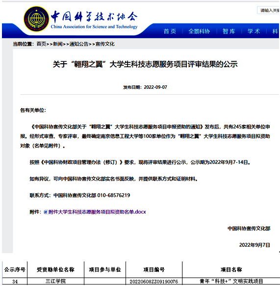 据悉,“翱翔之翼”大学生科技志愿服务项目由中国科协向全国范围遴选。该项工作按照《中国科协 教育部 共青团中央 中央文明办关于联合开展高校大学生科技志愿服务工作的通知》的总体部署和中国科协项目管理办法有关规定,对有创新、有特色的大学生科技志愿服务优秀项目给予资助激励,以此提升大学生科技志愿服务工作的质量效益。2022年度全国高校共有100个项目获得立项。