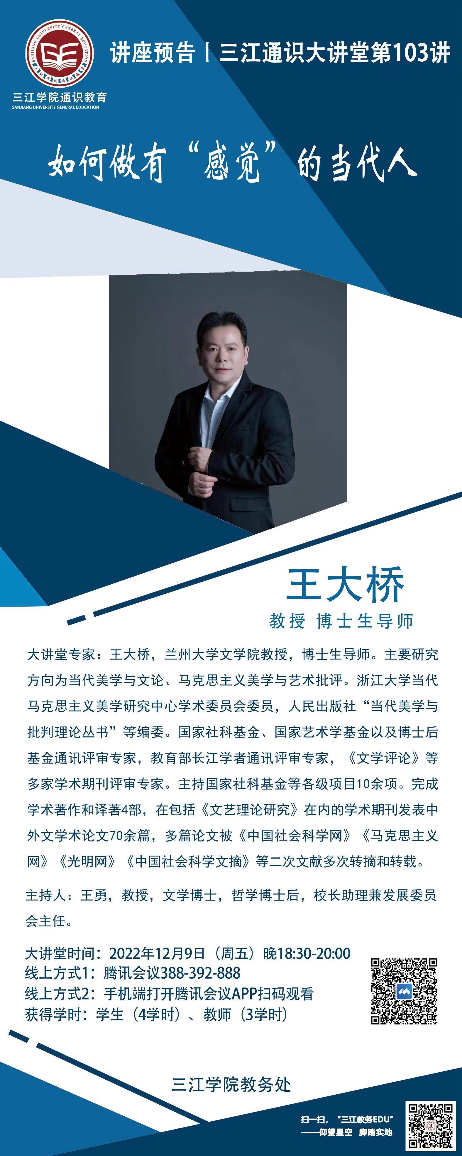 大讲堂专家:王大桥,文学博士、博士后,兰州大学文学院教授,博士生导师,兰州大学文艺评论中心主任,艺术学理论学科带头人。主要研究研究方向为当代美学与文论、马克思主义美学与艺术批评。浙江大学当代马克思主义美学研究中心学术委员会委员,人民出版社“当代美学与批判理论丛书”、东方出版中心“批判美学与当代艺术批评丛书”编委。国家社科基金、国家艺术学基金以及博士后基金通讯评审专家,教育部长江学者通讯评审专家,《文学评论》等多家学术期刊评审专家。主持国家社科基金一般项目、国家社科基金重大项目子课题以及省社科基金项目等各级项目10余项,目前正在主持国家社科基金一般项目“当代批判理论的美学问题研究”。完成学术著作和译著4部,在包括《文艺理论研究》在内的学术期刊发表中外文学术论文70余篇,多篇论文被《中国社会科学网》《马克思主义网》《光明网》《中国社会科学文摘》《人大复印资料》等二次文献多次转摘和转载,研究成果曾获甘肃省哲学社会科学优秀成果二等奖。多次获得甘肃省优秀博士学位论文和硕士学位论文指导老师。