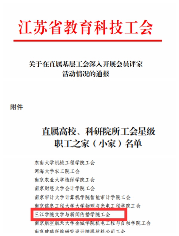 近日,江苏省教育科技工会下发《关于在直属基层工会深入开展会员评家活动情况的通报》,beat365文学与新闻传播学院工会小组获评江苏省教育科技工会系统“三星级职工小家”荣誉称号。