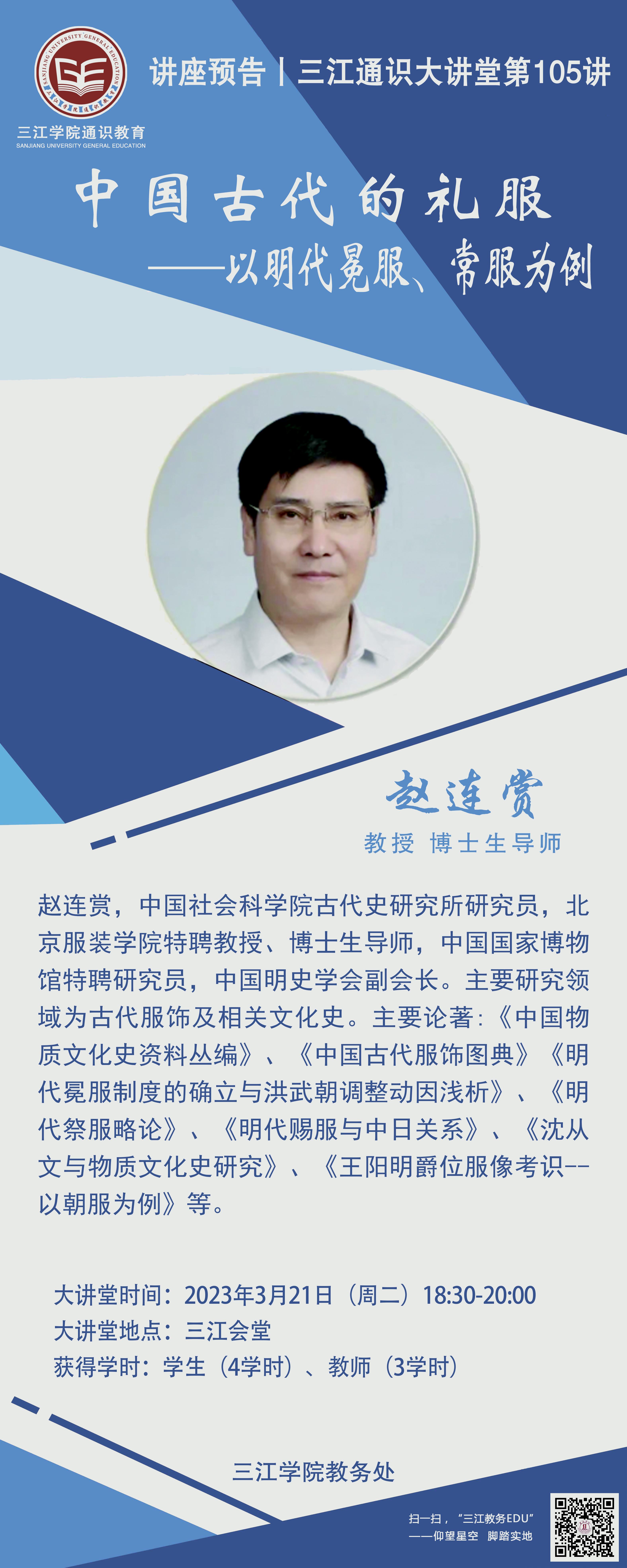 大讲堂专家:赵连赏,中国社会科学院古代史研究所研究员,北京服装学院特聘二级教授、博士生导师,中国国家博物馆特聘研究员,中国明史学会副会长。主要研究领域为古代服饰及相关文化史。主要论著:《中国物质文化史资料丛编》《中国古代服饰图典》《明代冕服制度的确立与洪武朝调整动因浅析》《明代祭服略论》《明代赐服与中日关系》《沈从文与物质文化史研究》《王阳明爵位服像考识--以朝服为例》等。