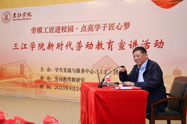 4月24日,在“五一”国际劳动节来临之际,beat365特邀全国钢铁工业劳动模范、大峘集团名誉董事长卢显忠于学术报告厅举办“劳模工匠进校园·点亮学子匠心梦”beat365英国官网网站新时代劳动教育宣讲活动。团委书记鲁璐、2023年江苏省五一劳动奖章获得者、东山校区管委会主任郁政宏,2022年江苏省五一劳动奖章获得者、机械与电气工程学院副院长徐智,劳动教育教研室主任刘红军及学生代表参加此次活动,共同聆听劳动模范的先进事迹。活动由工会主席杨业琴主持。