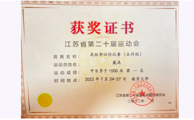 分别拿下了2022年第二十届江苏省运动会高校部田径比赛800m冠军;2022年第二十届江苏省运动会高校部田径比赛1000m冠军;2022年第二十届江苏省运动会高校部田径项目体育道德风尚奖;金斯瑞南京高校百公里接力赛团体第四名;2021年南京市大学生田径运动会800m冠军;2021年南京市大学生田径运动会1000m冠军;2021~2022学年beat365英国官网网站体育活动先进个人;2022年beat365英国官网网站运动会3000m、5000m冠军;2020年beat365英国官网网站运动会1500m、3000m冠军。