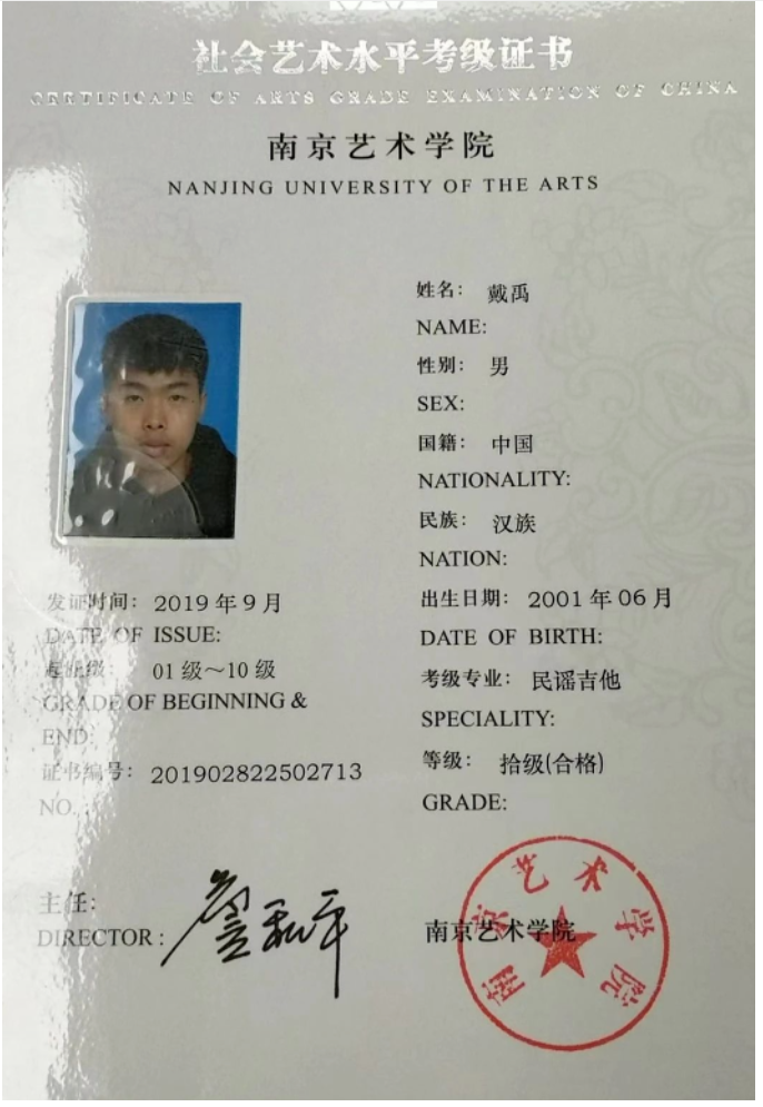 他在2019年台州吉他艺术节暨首届摩丁璐易莎全国吉他邀请赛中,荣获民谣指弹少年组银奖。在业余时间,戴禹还考取了南艺民谣吉他十级证书。