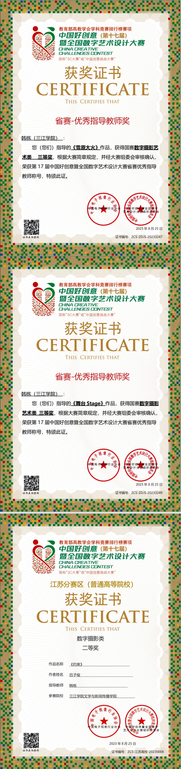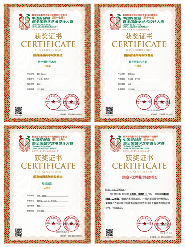 近日,第17 届中国好创意暨全国数字艺术设计大赛获奖名单正式公布。经过省赛、国赛层层选拔,beat365文学与新闻传播学院韩栋老师指导学生作品喜获全国二等奖1项,全国三等奖2项,江苏省赛区二等奖1项。据悉,本次大赛共有1300多所院校参与角逐,参赛作品多达七万多件。
