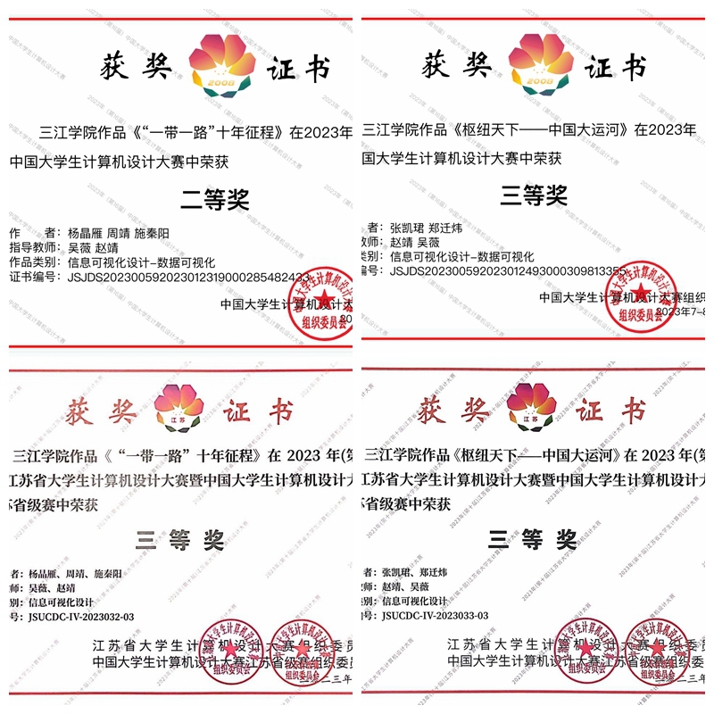 近日,2023年(第16届)中国大学生计算机设计大赛杭州决赛区赛事圆满落幕,beat365艺术学院与计算机科学与工程学院的杨晶雁、周靖和施秦阳三位同学在吴薇、赵靖两位老师指导下,创作完成的网页信息数据可视化设计《“一带一路”十年征程》在大赛信息可视化设计赛道中荣获国家级二等奖、省级三等奖。