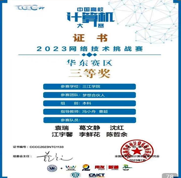 9月9日,“2023中国高校计算机大赛(C4)网络技术挑战赛”全国总决赛圆满结束,法商学院互联网金融专业的袁瑞、陈哲余、沈红、李鲜花、葛文静、江宇馨6位同学组成的“梦想合伙人”团队脱颖而出,荣获2023年C4网络技术挑战赛选拔赛B-EP2赛项华东赛区三等奖。冯小舟、曹超获得优秀指导老师。
