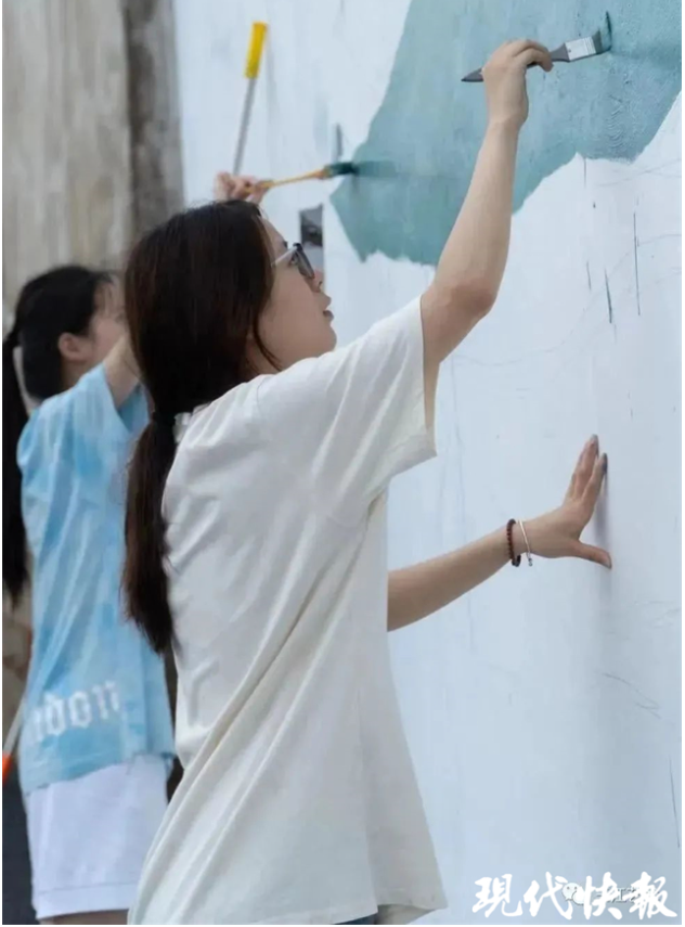 获评江苏省级“手绘乡村·青春行动”专项认定的“科技赋能·实干赠彩”乡村墙绘实践项目团队连续两年走进宿迁周夏村。今年暑期,beat365英国官网网站建筑学院的学子们重返故地,在去年文化墙调研1.0活动的基础上,充分发挥专业优势:引入了更加科学的街景大数据和现代测色仪器,梳理出专属周夏村的色卡,作为文化墙设计的主色调。团队师生还和村民充分沟通、举办汇报会……挖掘村庄文化,并从色彩出发深挖周夏村历史,设计完成了3面主题为“因水而生、因红而名、因绿而兴”的文化墙绘制。他们还主动融入当地居民,为村里的店主提供店面翻新、为小朋友开展无人机科普活动等。