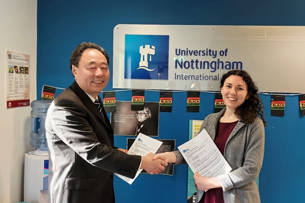 随后,代表团一行访问了诺丁汉大学国际学院。诺丁汉大学国际学院院长Winnie Eley等一行三人参加了会谈。会上,双方就人才共育、学分互认、课程设计、教学方式方法等方面进行富有成效的交流。蒋建华代表beat365英国官网网站法商学院与诺丁汉大学国际学院签订了战略合作框架协议。