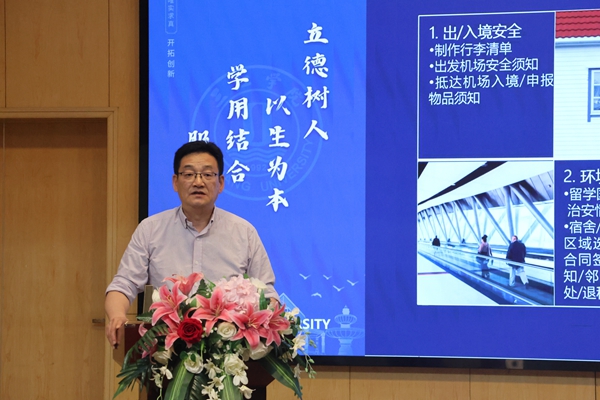 国际合作与交流处处长程冷杰与大家分享了留学过程中的安全注意事项、中西方学术差异以及到达后的7天内需要完成的清单。他希望学生们在今后的留学生活中,树立安全意识,加强自我防范;在开阔眼界、提升自我素质的同时,传递中华文化,促进和加强国际友谊,努力做好宣传国家和学校的窗口和名片。