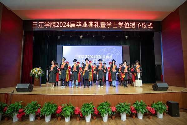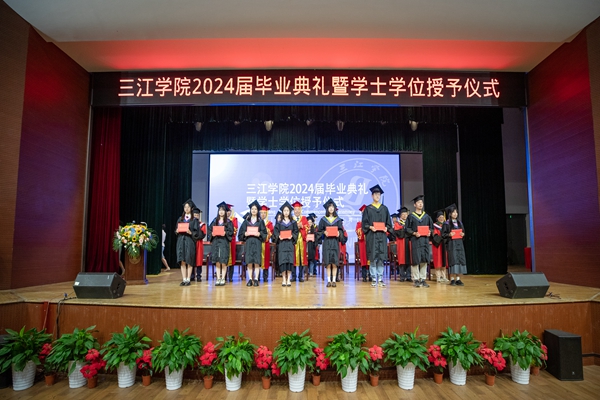 唐万宏宣读了《关于授予2024届毕业生学士学位的决定》《关于表彰2024届优秀毕业生的决定》,主席台领导为优秀毕业生颁发荣誉证书,为毕业生代表颁发毕业证书,为获得学士学位的毕业生代表学士帽拨穗并授予学位证书。