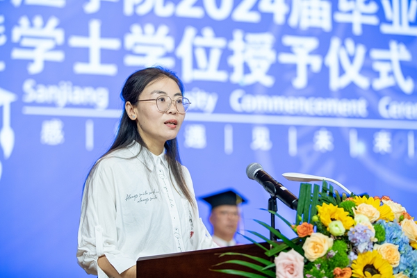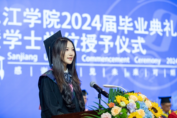 法商学院2020级会计学专业殷晨汐同学今年以优异成绩考取墨尔本大学研究生,作为毕业生代表,她深情讲述了自己难忘的三江记忆,道出了学子们的三江情怀。她祝愿三江毕业生们带着三江的精神和力量继续前行,胸怀梦想,努力拼搏,无愧于亲人和朋友,无愧于自己和人生,无愧于社会和未来。