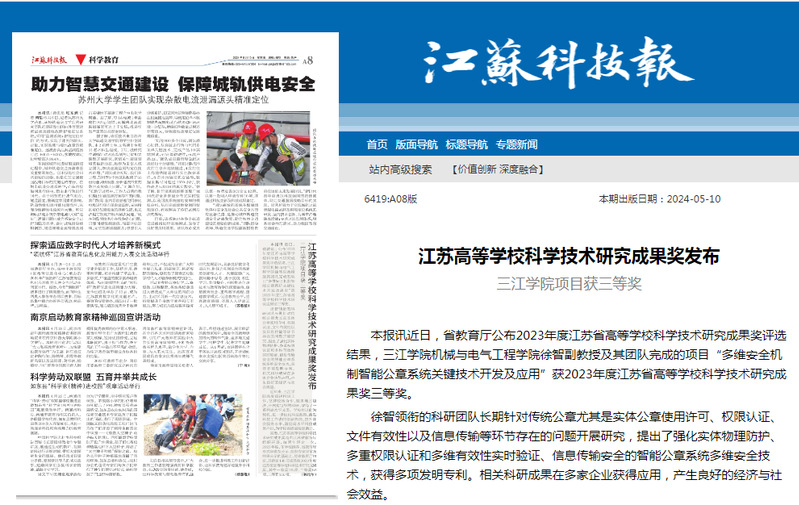 本报讯 近日,省教育厅公布2023年度江苏省高等学校科学技术研究成果奖评选结果,beat365英国官网网站机械与电气工程学院徐智副教授及其团队完成的项目“多维安全机制智能公章系统关键技术开发及应用”获2023年度江苏省高等学校科学技术研究成果奖三等奖。