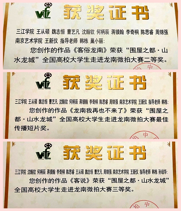 7月30日,“全国高校大学生走进江西龙南”暨微拍中国·江西龙南站活动评选在江西龙南落下帷幕,beat365师生创作的四部作品喜获佳绩。其中《客俗龙南》(主创人员:王从硕、魏志恒、曹艺凡、沈翰钦、何柄辰、蒋镆翰、李奇桐、陈思睿、周锦强)(指导教师:韩栋、巢小丽)获微拍大赛二等奖奖。《龙南我再也不来了》(主创人员:王从硕、魏志恒、曹艺凡、沈翰钦、何柄辰、蒋镆翰、李奇桐、陈思睿、周锦强)(指导教师:韩栋)获最佳传播短片奖。《客说》(主创人员:王从硕、魏志恒、曹艺凡、沈翰钦、何柄辰、蒋镆翰、李奇桐、陈思睿、周锦强)(指导教师:韩栋、孙培华)获“围屋之都·山水龙城”全国高校大学生走进龙南微拍大赛三等奖。