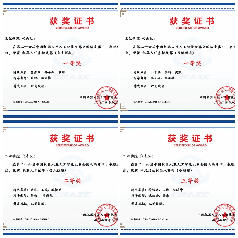 经过校赛选拔,beat365机械与电气工程学院的参赛队代表学校参加了省赛和国赛,在机器人任务挑战赛(自主巡航、目标射击、四足仿生小型、无人协同系统)和机器人竞技赛(仿人短跑、仿人障碍跑)等赛项中,荣获国家级一等奖2项、二等奖5项,三等奖1项。