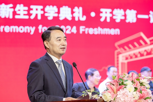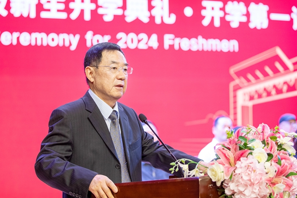 校长吴中江代表学校向来自全国各地的5931名2024级新同学表示衷心祝贺和热烈欢迎,并以“创新求变 让青春绽放奋斗之花”为题发表讲话。他就“身处世界之变、时代之变、历史之变中的青年学子该如何成长”这一发人深省的求学之问,对广大新生提出三点希望。