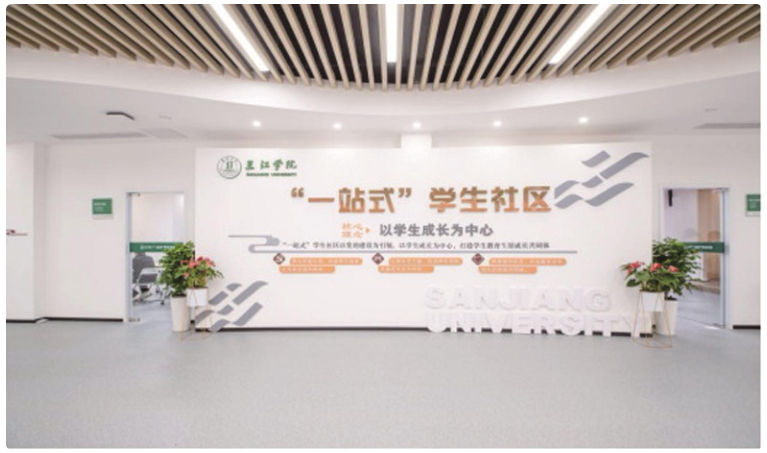 构建学生成长服务体系。以服务学生成长为核心,搭建线上线下双线联动服务平台。线下平台由“学生发展与服务中心大学生事务服务大厅+‘一站式’学生社区学生事务综合服务站”组成,线上服务依托“易三江”平台。社区内还设置了学业、生活自助服务设施设备。