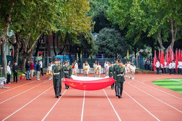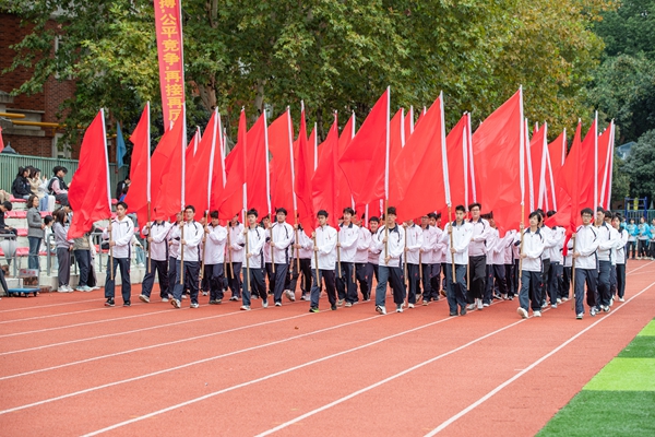 伴着雄壮有力的运动员进行曲,国旗队方阵、校旗队方阵、鲜花队方阵、红旗队方阵及各学院运动员方阵迈着矫健的步伐入场,喊着响亮的口号,整齐有序地通过主席台。