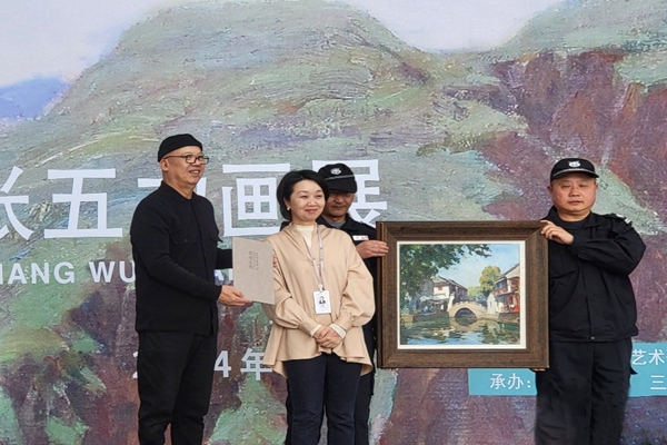 江苏省油画学会主席、南京艺术学院原副校长陈世宁教授在致辞中对张五力教授的画作给予了高度评价,认为其作品不仅在表现手法上成熟老练,色彩与笔触的运用也展现了极高的造诣,令人如临其境,思绪共鸣。随后,张五力教授向苏州美术馆捐赠了作品,杨艺馆长为张教授颁发了收藏证书。