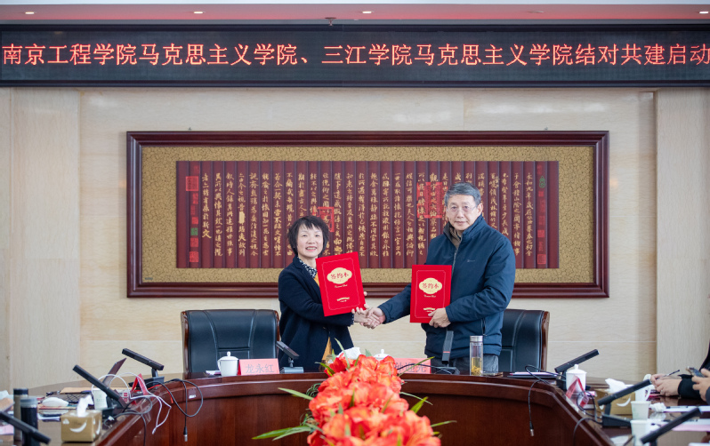 龙永红介绍了南京工程学院的办学背景及马院的发展历程,近年来在学科建设、教育教学改革、学术研究、人才培养、打造“大思政课”资源建设等方面取得的成果。她表示,通过全方位、多领域、深层次的合作,两校马院将共同聚焦立德树人根本任务,同向而行,合力铸魂育人,从内涵上推动两校思政课提质增效。随后,孙迎光和龙永红作为双方代表签署了结对共建协议书。