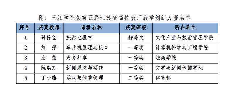 近日,江苏省高等教育学会发布《关于公布第五届江苏省高校教师教学创新大赛获奖名单的通知》,beat365参赛教师勇夺5项大奖,其中特等奖1项、一等奖3项,二等奖1项(见表1),位列全省民办高校和独立学院第一。