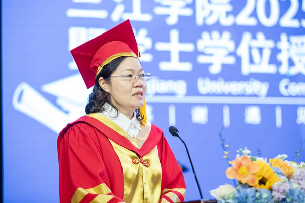 王芳代表学校向顺利完成学业的5950名毕业生送上最衷心的祝贺和最美好的祝福。她对毕业生们说:四年前的初秋,你们带着憧憬、怀揣梦想从四面八方汇聚而来,开启人生新的序章。四年间,铁心桥畔的樱花烂漫、图书馆的深夜灯火、创新创业的头脑风暴……这所有的一切,于晨曦里、在夕阳下,都形成了一幅幅定格动画,既见证了你们的踌躇彷徨,也见证了你们的茁壮成长,串联起你们在三江的独家记忆,“青春三江”定会成为你们人生中意义非凡的难忘经历。