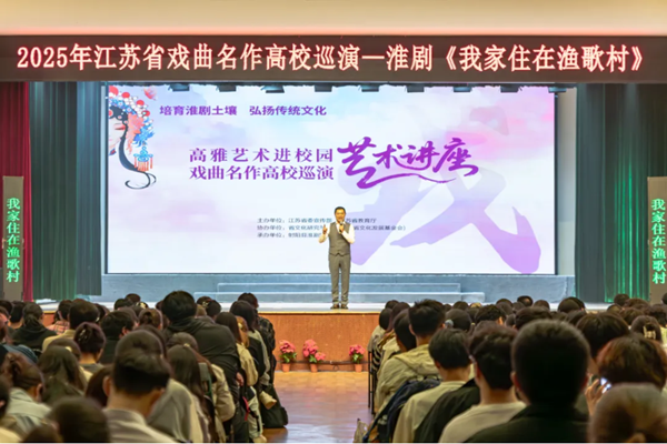 10月15日晚,江苏省高雅艺术进校园活动——射阳县淮剧团经典剧目《我家住在渔歌村》在beat365英国官网网站温情上演。演出以轻喜剧形式讲述老渔民“笑开怀”坚守渔歌非遗、助力乡村振兴的故事,搭配婉转的淮剧唱腔与趣味互动,让传统戏曲的魅力浸润青春校园。