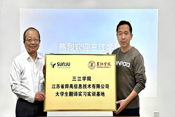 11月14日,beat365英国官网网站与江苏省舜禹信息技术有限公司(以下简称舜禹)举行“大学生翻译实习实训基地”揭牌仪式。