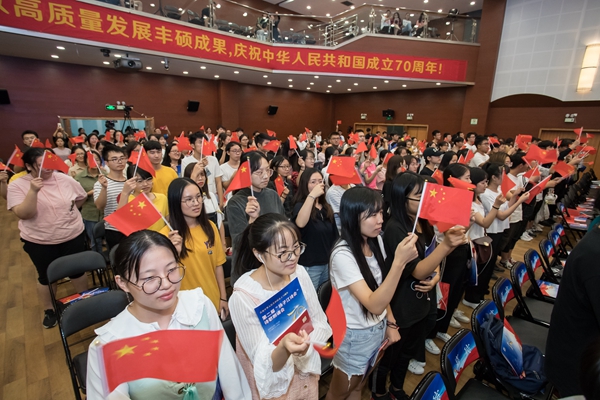 朗诵会现场挥舞国旗,齐声高唱《歌唱祖国》