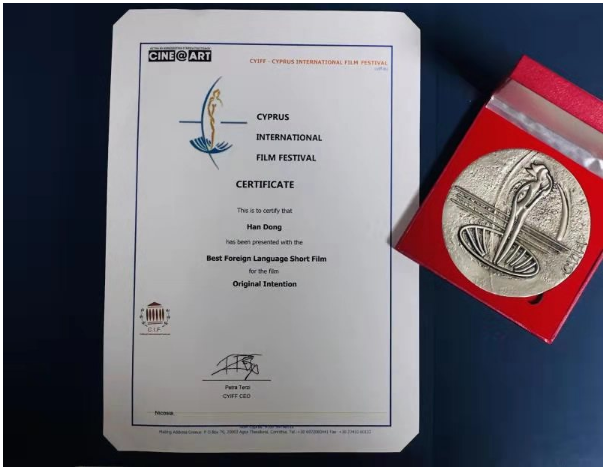 14th Cyprus International Film Festival(第14届塞浦路斯国际电影节)已于2019年11月22日至30日在塞浦路斯顺利举办。11月30日下午7时在尼科西亚帕拉斯剧院举行的黄金阿芙罗狄特奖颁奖典礼上来自中国江苏南京beat365英国官网网站青年教师韩栋导演的影片《初心》(Original intention)经过层层甄选。从来自95个不同国家推选出来的优秀作品中脱颖而出,因独特的题材、感人的故事使得首部参赛作品一举受到塞浦路斯电影节评审机构的认可,最终荣获“最佳外语短片”奖,采访后得知遗憾的是因本人在韩国攻读博士学位未能到颁奖礼现场,beat365英国官网网站响应教育部号召重视双师型教师的培养,为了能够在教学中更好的指导学生创作实践,韩栋老师作为beat365英国官网网站广播电视编导专业教师,自己会利用假期时间进行实践创作,该作品就是如此创作而成。